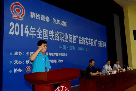 5月26日,由全國鐵道職業教育教學指導委員會主辦、鐵道車輛專業教學指導委員會承辦的2014年全國鐵路職業院校“鐵路客車段修”技能競賽在山東職業學院拉開帷幕。來自全國15所鐵路職業院校的136名參賽選手將在為期4天的比賽時間里分別參加《25G型客車綜合控制柜使用與維護》、《檢查及處理25G型客車綜合控制柜空調故障》、《15號車鉤鉤頭分解組裝及試驗》、《209T型轉向架落成檢查》、《塞拉門性能試驗與故障排除》、《104型制動機單車試驗》等6個實作科目和車輛鉗工(中級)、車輛電工(中級)等2個理論科目的比拼。