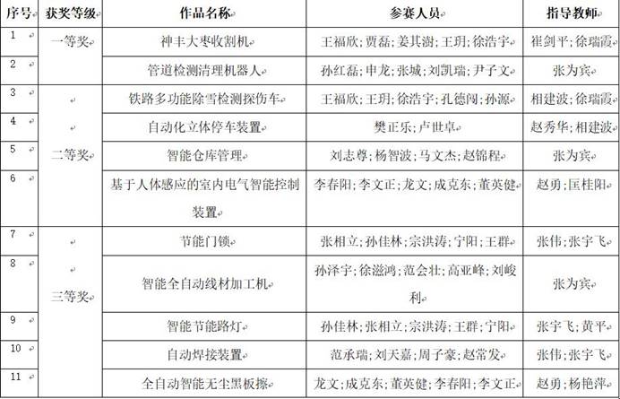 經過賽前挑燈夜戰(zhan)對機(ji)器人進行設計(ji)和反復的(de)調(diao)試,賽場上出色發揮,最終(zhong),由(you)崔劍(jian)平、徐瑞(rui)霞(xia)老(lao)師指(zhi)導,王福欣、賈磊、姜其澍、王玥、徐浩宇(yu)等(deng)(deng)五(wu)位同學制作(zuo)的(de)《神豐大棗收割機(ji)》獲主(zhu)題(ti)采摘(zhai)項(xiang)目(mu)一等(deng)(deng)獎(jiang),由(you)張為(wei)賓老(lao)師指(zhi)導,孫紅磊、申龍、張城、劉凱瑞(rui)、尹子文等(deng)(deng)五(wu)位同學制作(zuo)的(de)《管(guan)道檢測(ce)清理機(ji)器人》獲創意展(zhan)示項(xiang)目(mu)一等(deng)(deng)獎(jiang)。《鐵路多(duo)功(gong)能(neng)(neng)除雪檢測(ce)探傷(shang)車》《自(zi)(zi)動(dong)化立體(ti)停車裝置(zhi)》《智(zhi)能(neng)(neng)倉庫管(guan)理》《基于人體(ti)感應的(de)室內電氣智(zhi)能(neng)(neng)控(kong)制裝置(zhi)》等(deng)(deng)四個(ge)作(zuo)品獲大賽二等(deng)(deng)獎(jiang),《節(jie)能(neng)(neng)門鎖》《智(zhi)能(neng)(neng)全自(zi)(zi)動(dong)線材加工機(ji)》《智(zhi)能(neng)(neng)節(jie)能(neng)(neng)路燈》《自(zi)(zi)動(dong)焊接裝置(zhi)》《全自(zi)(zi)動(dong)智(zhi)能(neng)(neng)無塵黑板擦》等(deng)(deng)五(wu)個(ge)作(zuo)品獲大賽三等(deng)(deng)獎(jiang)。