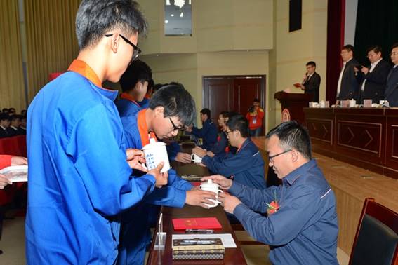 山東省教育廳職教處處長梁斌言出席儀式并致辭,青島地鐵集團有限公司副總經理劉高軍在儀式上講話,學院黨委書記王榮昌主持儀式,學院院長秦河在儀式上講話并向青島地鐵集團有限公司帶徒師傅代表楊業敬、張洪臣、田杰、常文廣、呂彥明等頒發了師傅聘書。拜師儀式按照我國傳統拜師禮儀進行,10名徒弟代表向5位師傅代表敬茶、謝師恩,師傅為徒弟佩戴安全帽并贈送學習用品。拜師禮成后,現場簽訂了師徒協議。簽訂協議,不是一個空虛的形式。一紙協議,它承載的是期望與責任。該班學員作為青島地鐵的準員工,將按青島地鐵集團有限公司的要求進行培養,畢業后進入青島地鐵集團有限公司工作。隨后,師傅代表楊業敬、徒弟代表陳鵬飛先后發言。