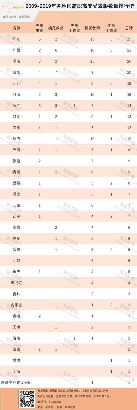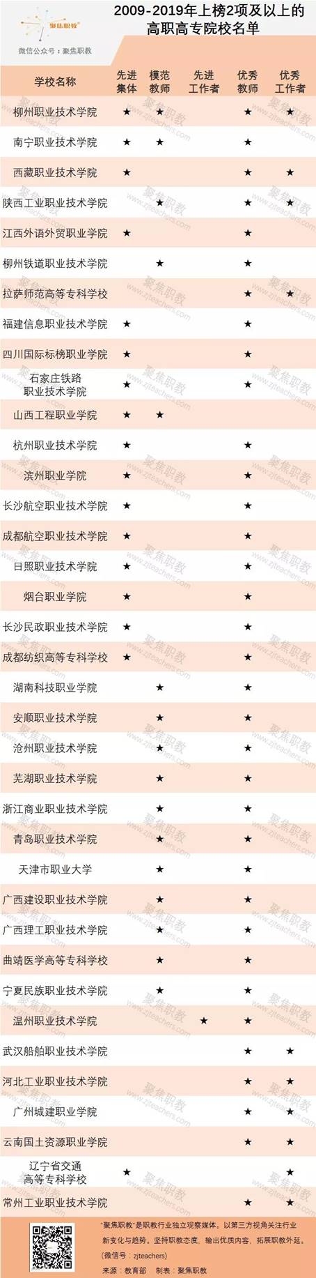 聚焦職教特別查找了2009年、2014年、2019年這三次表彰全國教育系統先進集體和個人的名單,并整理出上榜的高職高專院校與高職高專教師。