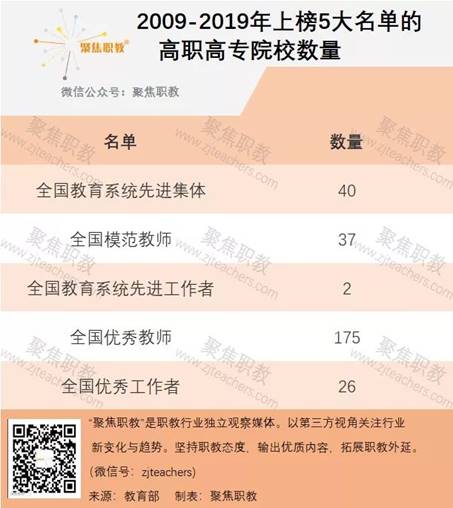 我們發現這11年來,全國有40所高職高專院校被評為“全國教育系統先進集體”,240位高職高專院校的老師因先進個人被表彰,其中175名職校教師被表彰為“全國優秀教師”。