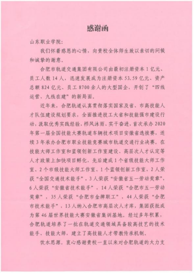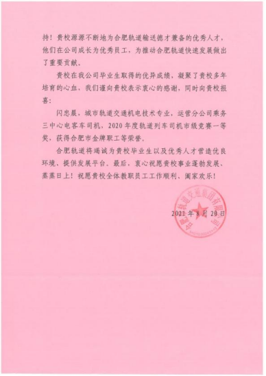 近日,合肥市軌(gui)道(dao)交通集團(tuan)有限公司致(zhi)(zhi)函我(wo)校(xiao),感謝我(wo)校(xiao)源源不斷地為(wei)合肥軌(gui)道(dao)輸送德才兼(jian)備的優(you)秀人(ren)才,特向我(wo)校(xiao)發(fa)函致(zhi)(zhi)謝!