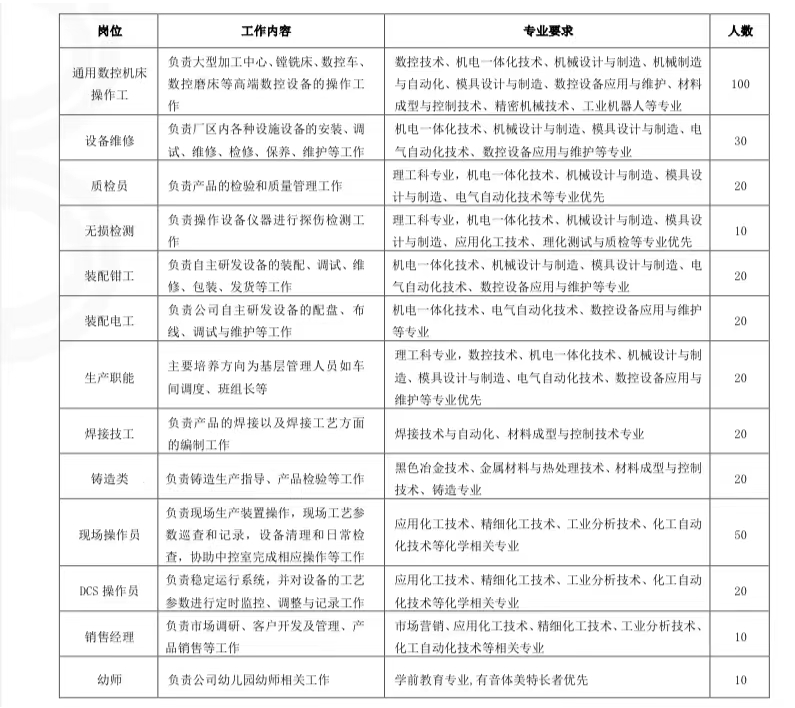 數控技術、機(ji)電(dian)一體化技術、機(ji)械設(she)計與制(zhi)(zhi)造、機(ji)械制(zhi)(zhi)造與自(zi)動化、模具(ju)設(she)計與制(zhi)(zhi)造、電(dian)氣自(zi)動化技術、數控設(she)備應用與維護(hu)、焊接(jie)技術、材料(liao)類、化工(gong)類、教育(yu)類等(deng)相關專業(ye)。
