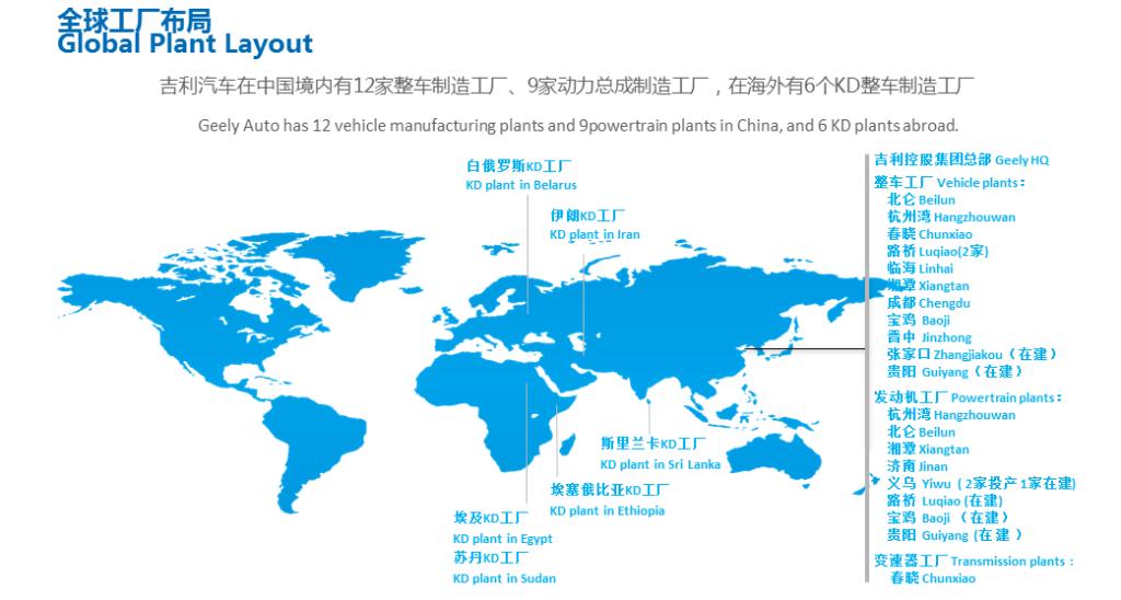 吉利控(kong)股集團(tuan)在中(zhong)國上海、杭州(zhou)、寧波(bo),瑞典哥德堡、英國考文垂、美國加州(zhou)、德國法蘭克福(fu)等地建有造型設計和工程研發(fa)中(zhong)心,研發(fa)、設計人員超過2萬人,擁有(you)國(guo)內外有(you)效專利超1.4萬項。在中國(guo)、美國(guo)、英國(guo)、瑞典(dian)、比(bi)利時、馬(ma)來(lai)西亞(ya)建有(you)世界一流的現代化(hua)整車和動力總成制造工廠,擁有(you)各(ge)類銷售網點超過4000家(jia),產品銷售及服務網絡遍(bian)布世界各(ge)地。