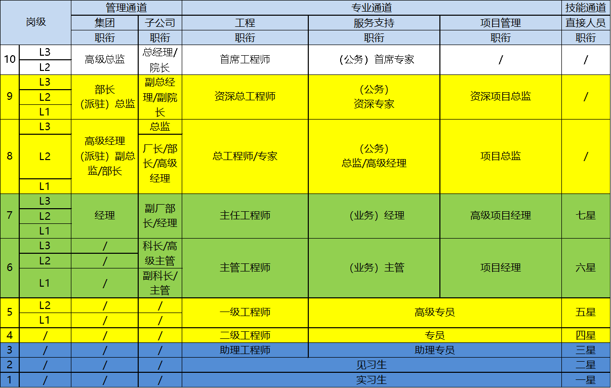 公司開辟了(le)多(duo)通道的(de)職業(ye)(ye)發(fa)展路徑(jing),開辟了(le)橫向和縱向的(de)發(fa)展通道,為員工(gong)職業(ye)(ye)發(fa)展提供了(le)更大的(de)空間(jian);每一層級都有任(ren)職要求及標準,實現了(le)員工(gong)事其所(suo)好,精其所(suo)專,得其所(suo)值(zhi),知(zhi)其所(suo)往。具(ju)體詳見下表: