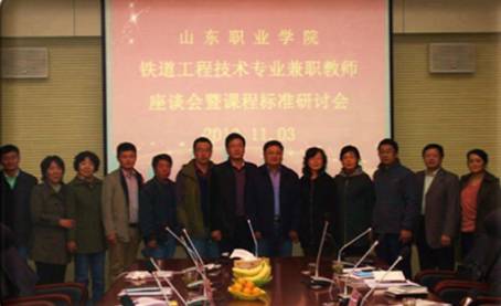 2013年11月3日,山東職業學院鐵道工程技術專業兼職教師座談會暨課程標準研討會在山東職業學院老校區會議中心隆重召開,會議邀請濟南鐵路局工務處、濟南鐵路局職教處、濟南鐵路局檢測中心、濟南鐵路局濟南西工務段、中鐵十局青島分公司、山東省地方鐵路局等企事業單位相關負責人及技術專家參加。土木工程系副主任步文萍主持會議,土木工程系主任郭兆軍出席會議并講話,鐵道工程專業相關人員出席會議。