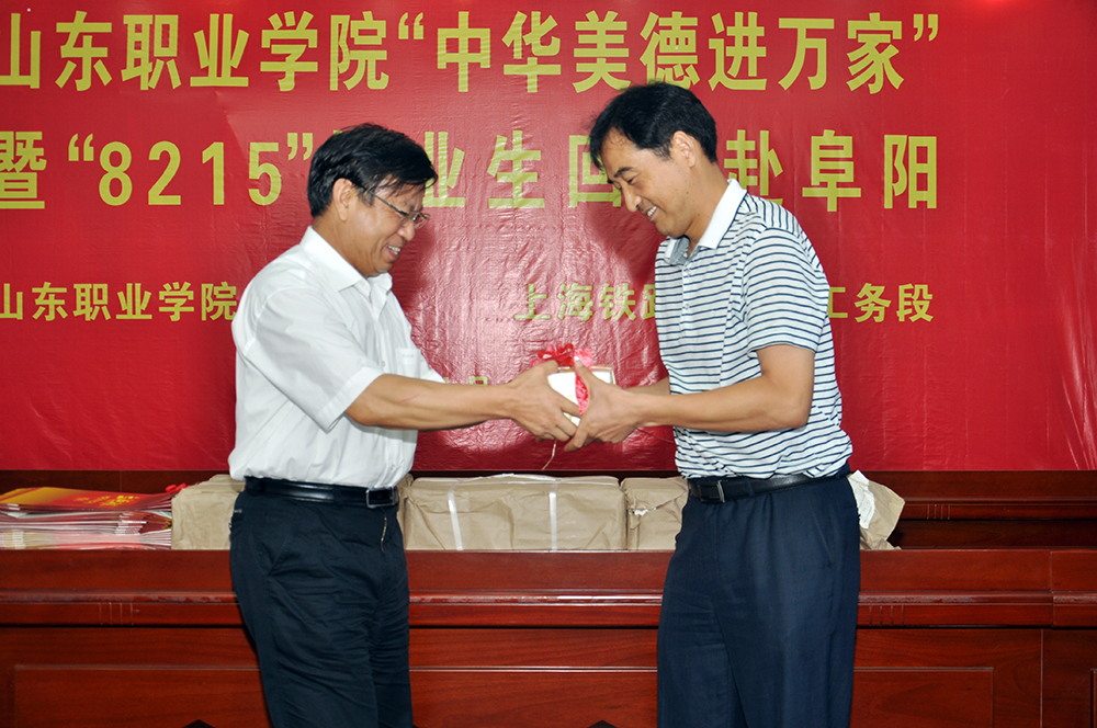 “寶劍鋒從磨礪出,梅花香自苦寒來。眼前多少難甘事,自古男兒當自強。”8月2日,山東職業學院2013年“中華美德進萬家”暨“8215”畢業生回訪活動土木工程系小分隊在學院黨委書記劉邦治的帶領下走進上海鐵路局阜陽工務段,與企業領導和優秀畢業生代表座談,共話合作治教、美德育人。學院黨委書記劉邦治,黨委宣傳統戰部部長王偉,土木工程系黨總支書記徐曉東、學工辦主任劉林、就業辦主任魏鵬、專業課教師柴振波,阜陽工務段段長吳文廣、黨委書記劉立順、副段長楊東曉等企業領導和相關部門負責人以及優秀畢業生代表參加活動并出席座談。劉邦治為活動致辭,代表學院向阜陽工務段贈送《中華傳統美德警句名言》書籍,宣布阜陽工務段為“山東職業學院美德教育社會實踐基地”。吳文廣主持儀式,并介紹了工務段基本情況和該段階梯式特色人才培養方法。劉立順為活動致辭,希望能以活動為契機加強企校間的聯系與合作,共同為祖國的鐵路事業發展培養優秀人才。“中華美德進萬家”宣傳小分隊在活動儀式上誦讀中華美德經典名言。
