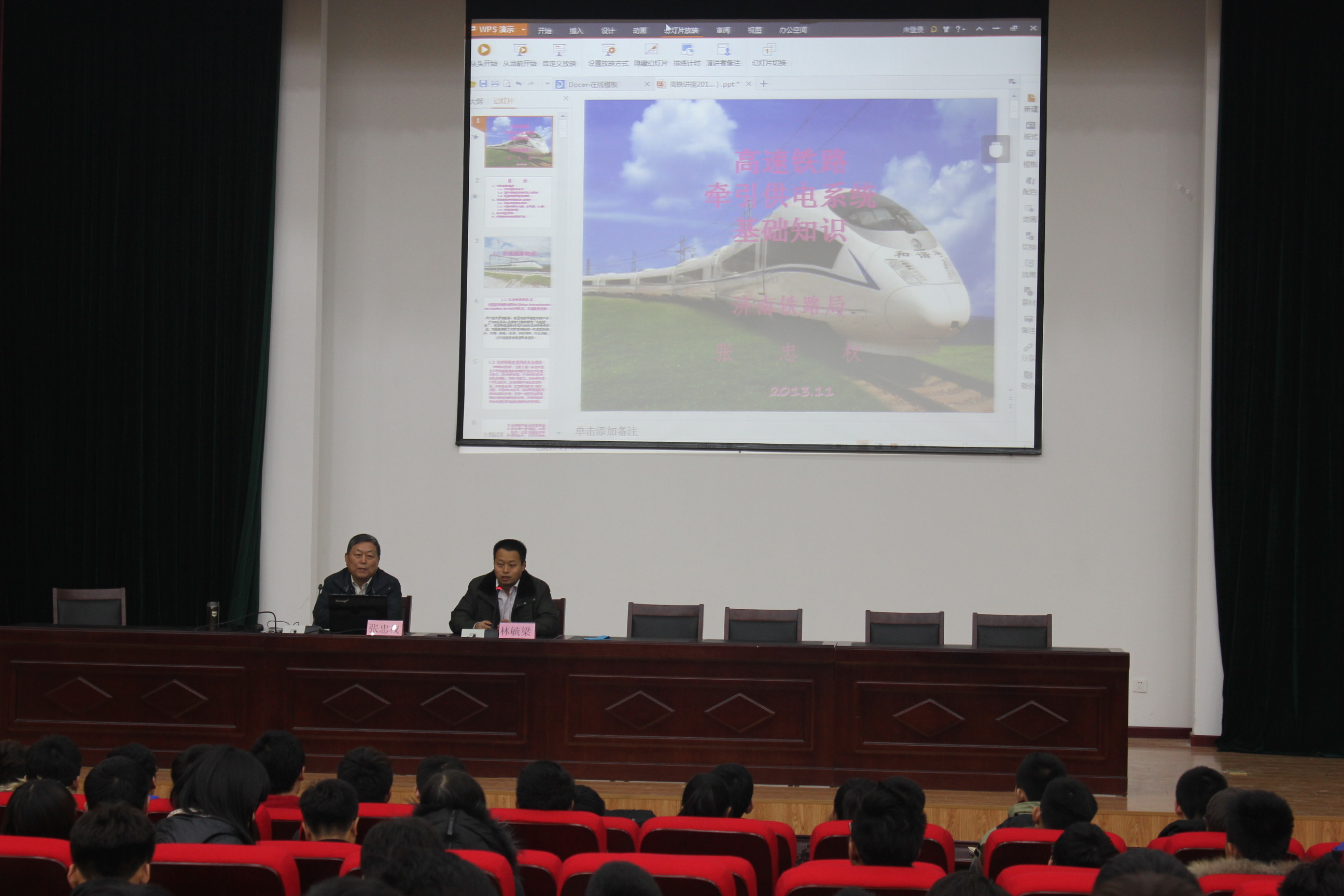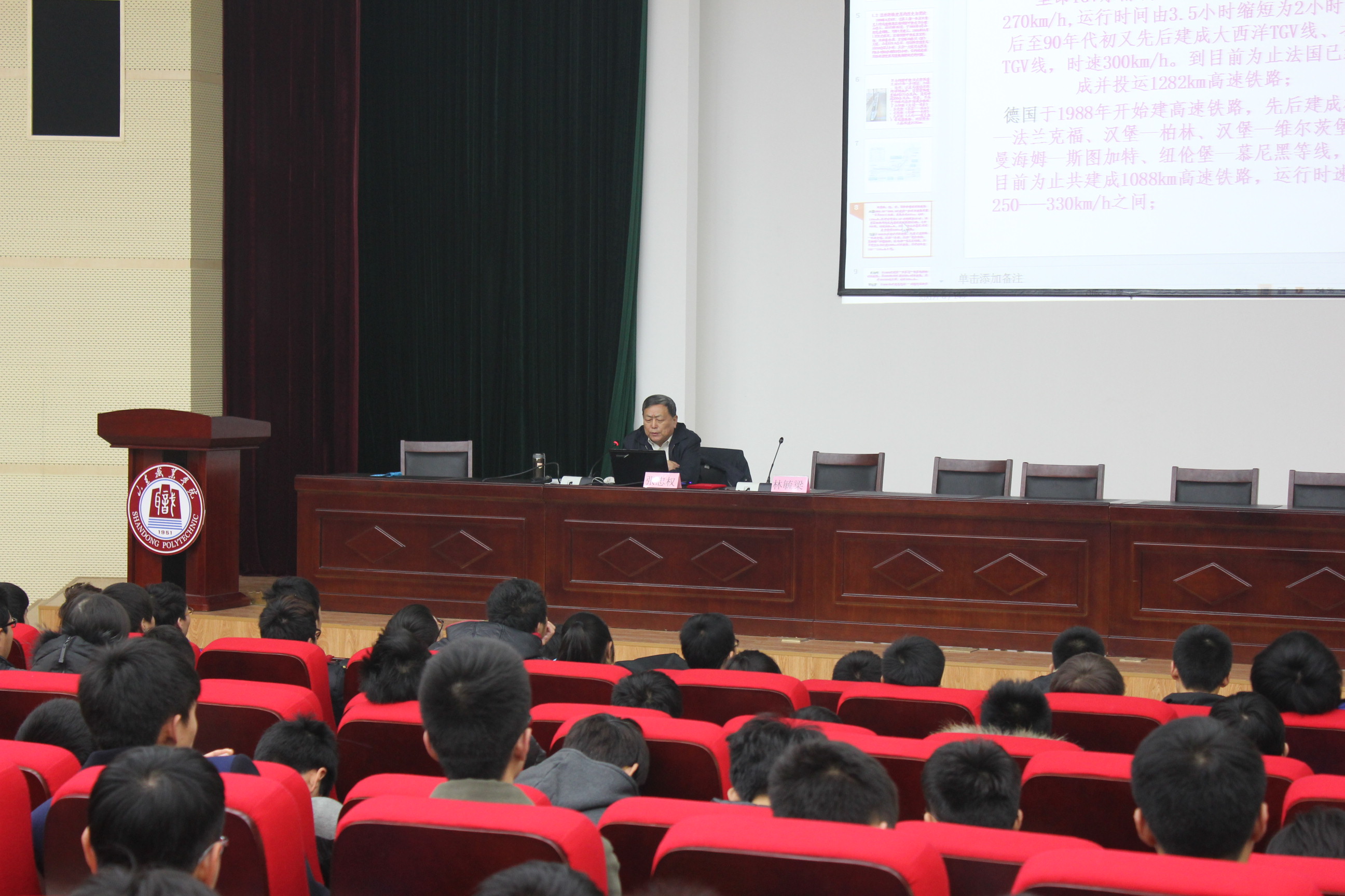 2013年12月23日,電(dian)氣工(gong)程(cheng)系(xi)(xi)邀請濟南(nan)鐵路局濟南(nan)供(gong)電(dian)段(duan)黨(dang)委書(shu)記(ji)、我(wo)(wo)院電(dian)氣化鐵道(dao)技術(shu)專(zhuan)(zhuan)業(ye)(ye)兼職帶頭(tou)人(ren)張(zhang)忠(zhong)權(quan)來校(xiao)做《我(wo)(wo)國高速鐵路發展》的學術(shu)講(jiang)(jiang)(jiang)座。講(jiang)(jiang)(jiang)座由電(dian)氣工(gong)程(cheng)系(xi)(xi)副(fu)主任、電(dian)氣化鐵道(dao)專(zhuan)(zhuan)業(ye)(ye)建(jian)設(she)項目(mu)負責(ze)人(ren)林毓梁(liang)主持,在講(jiang)(jiang)(jiang)座之前,林毓梁(liang)同志(zhi)首先向將張(zhang)忠(zhong)權(quan)同志(zhi)頒(ban)發了《山東職業(ye)(ye)學院兼職帶頭(tou)人(ren)聘書(shu)》。