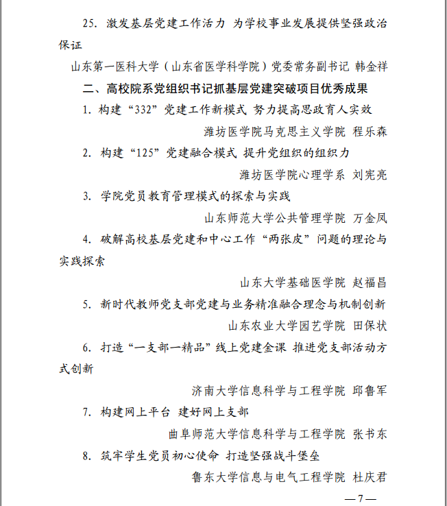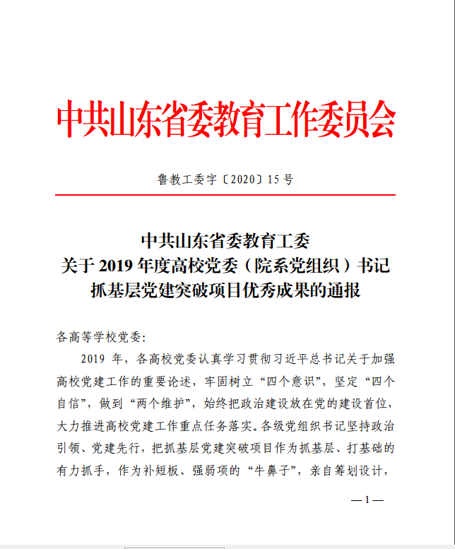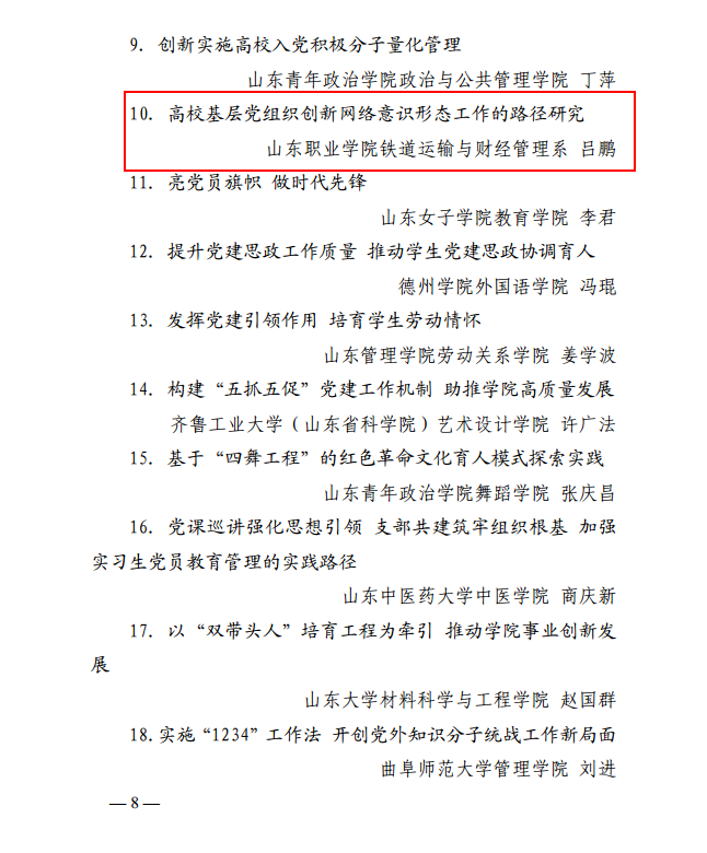 近日,中共山(shan)東(dong)省委(wei)教育工委(wei)發文,對(dui)全省25個高(gao)校(xiao)(xiao)黨(dang)委(wei)書記(ji)抓基(ji)層(ceng)黨(dang)建突(tu)破項(xiang)目(mu)優秀成果和(he)25個高(gao)校(xiao)(xiao)院系黨(dang)組(zu)(zu)織書記(ji)抓基(ji)層(ceng)黨(dang)建突(tu)破項(xiang)目(mu)優秀成果進行了通報表(biao)揚。我校(xiao)(xiao)鐵道運(yun)輸與財經管(guan)理系黨(dang)總支書記(ji)呂鵬(peng)同志抓基(ji)層(ceng)黨(dang)建突(tu)破項(xiang)目(mu)成果《高(gao)校(xiao)(xiao)基(ji)層(ceng)黨(dang)組(zu)(zu)織創新網絡意識形態(tai)工作的路徑研究》被評選(xuan)為優秀成果。