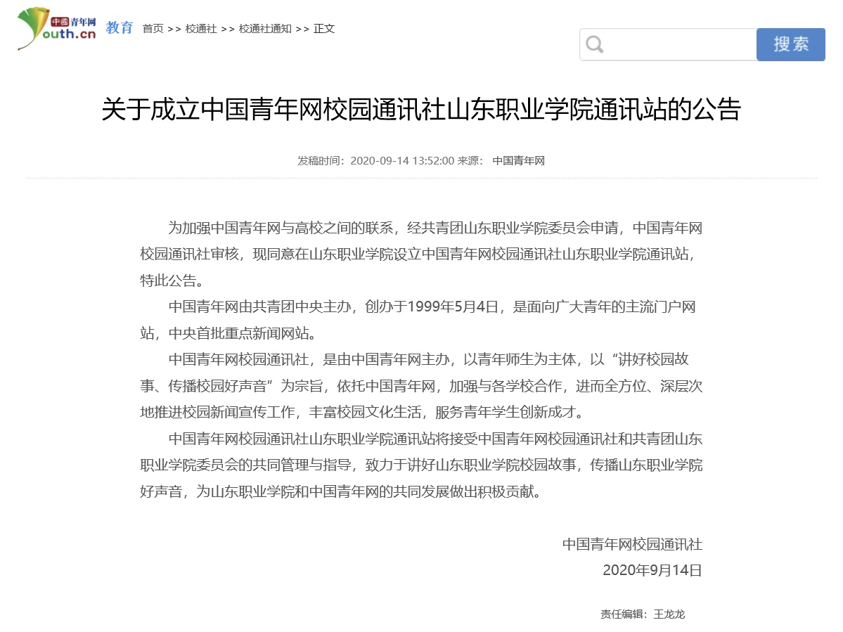 9月14日,中國(guo)青(qing)(qing)年網(wang)正式發(fa)布公告(gao),批準(zhun)在我校建立“中國(guo)青(qing)(qing)年網(wang)校園通(tong)訊社山(shan)東職(zhi)業學院通(tong)訊站(zhan)”。今后,本通(tong)訊站(zhan)將通(tong)過中國(guo)青(qing)(qing)年網(wang)、三(san)下(xia)鄉官網(wang)、中青(qing)(qing)校園等(deng)平臺(tai)進行校園新聞(wen)宣傳工作。
