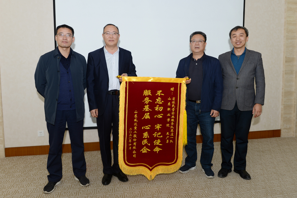 10月(yue)29日上午,山(shan)東威(wei)達(da)重(zhong)工股份有限公司副總(zong)經(jing)理、財務總(zong)監韓(han)杰和(he)(he)公司綜合(he)辦公室主(zhu)任徐偉(wei)(wei)偉(wei)(wei)專程來到山(shan)東職業學院,向(xiang)學校贈送了錦旗,感(gan)謝學校派出干部對(dui)企業的幫助和(he)(he)支持。副院長郭鵬(peng)接待了來訪(fang)客人。