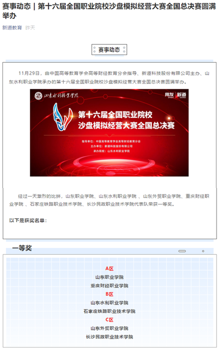 11月29日,第(di)十六屆全(quan)(quan)國(guo)職業院校沙盤模擬經營大賽(sai)全(quan)(quan)國(guo)總決賽(sai)落下(xia)帷幕。我校代表隊斬(zhan)獲(huo)(huo)A區全(quan)(quan)國(guo)一等獎(jiang)第(di)一名(ming)的(de)好(hao)成績,這是我校首(shou)次在(zai)該賽(sai)項中(zhong)進入國(guo)賽(sai)并獲(huo)(huo)得一等獎(jiang)。