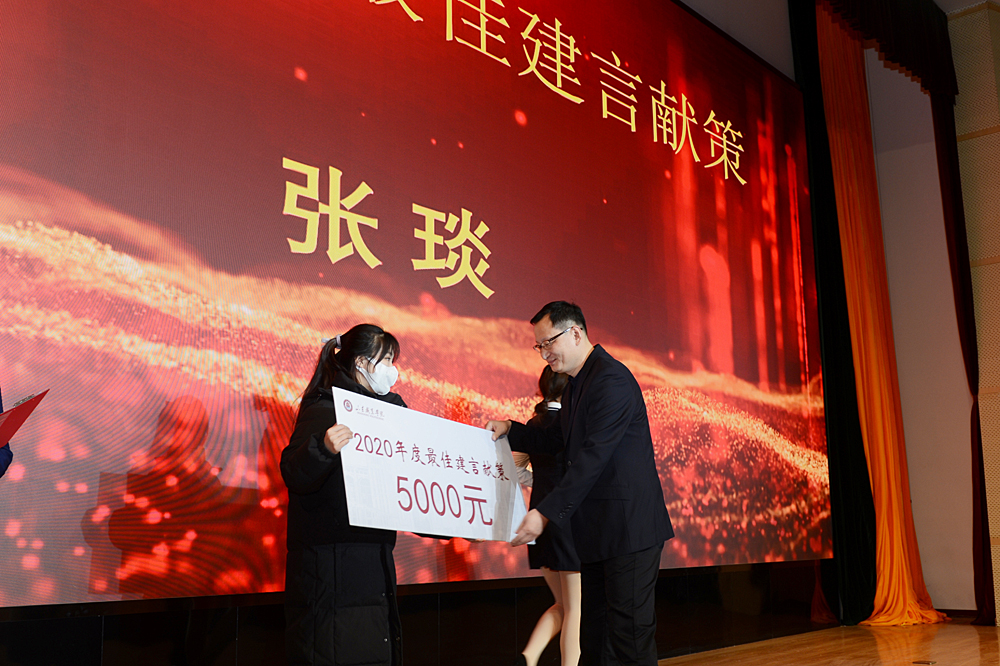 副(fu)院長郭培(pei)謙向易(yi)安書(shu)院學生張琰頒發了2020年(nian)度最佳建(jian)言獻策。