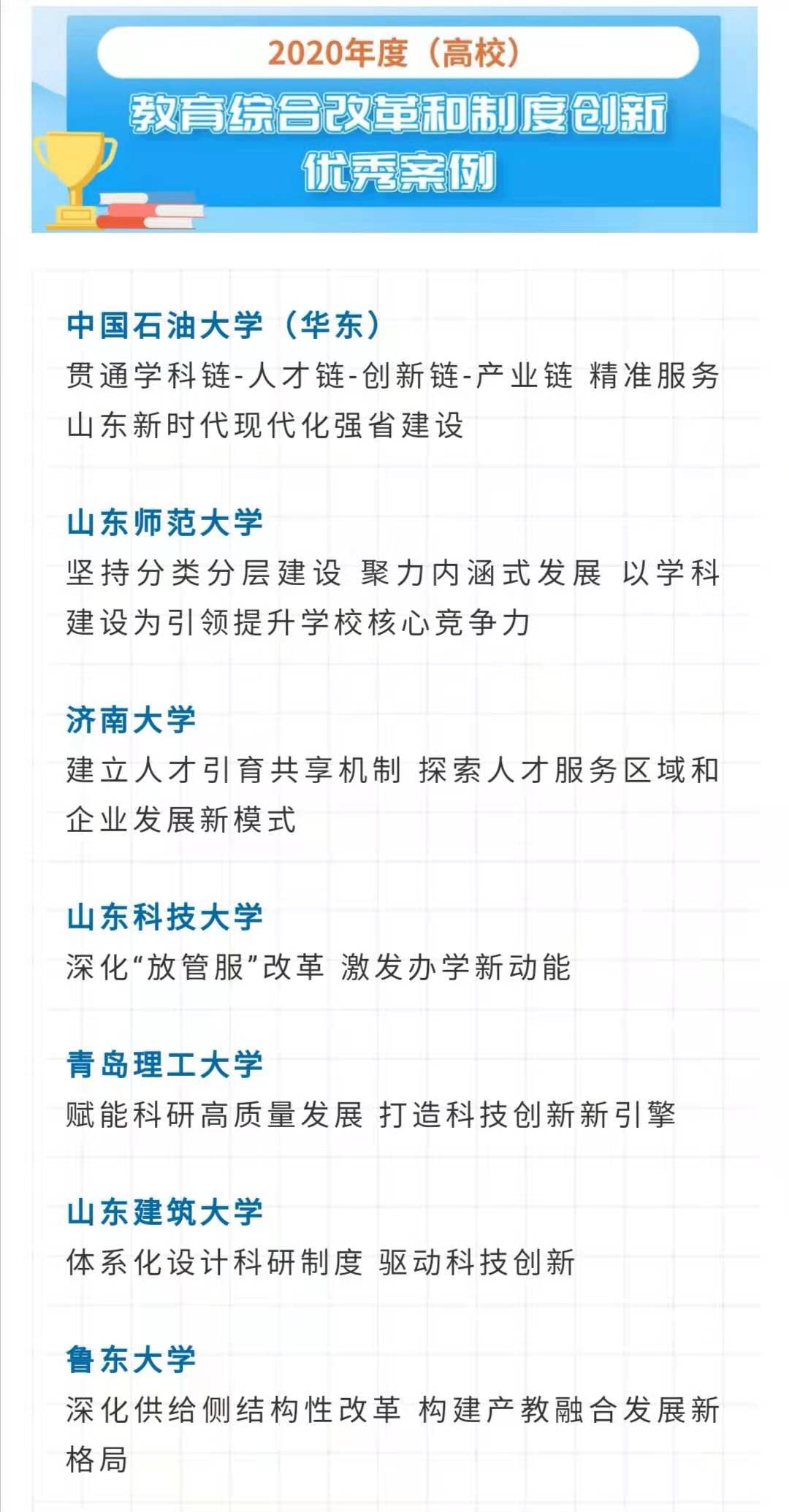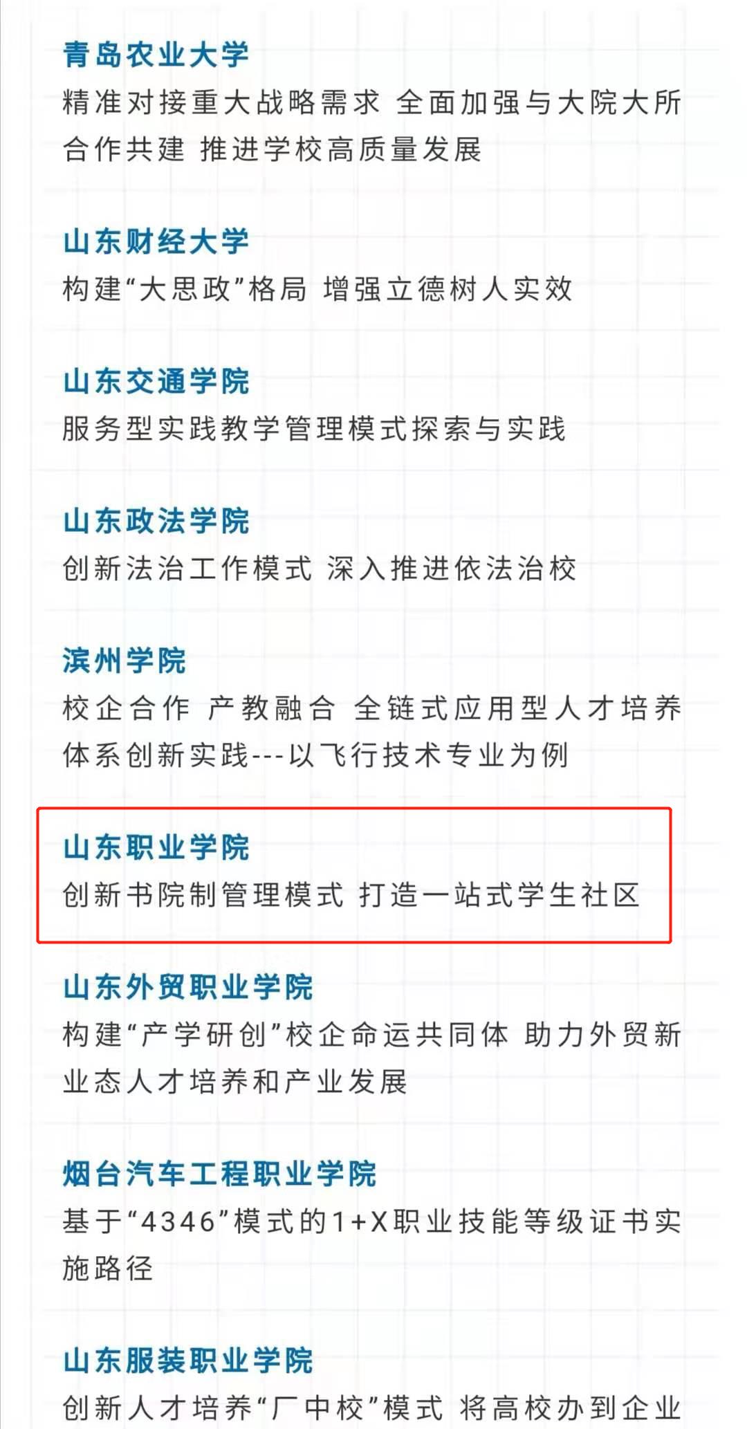 日(ri)前,山東省教(jiao)育廳下(xia)發《關于(yu)公布2020年度(du)(du)(du)教(jiao)育綜(zong)(zong)合(he)改革和制度(du)(du)(du)創(chuang)新典型案(an)(an)例(li)(li)評(ping)選結果(guo)的(de)通知》,我(wo)校報(bao)送的(de)“創(chuang)新書院制管(guan)理模(mo)式(shi),打造一站式(shi)學生社(she)區”典型案(an)(an)例(li)(li)榜上有名,被評(ping)為“2020年度(du)(du)(du)(高(gao)校)教(jiao)育綜(zong)(zong)合(he)改革和制度(du)(du)(du)創(chuang)新優秀案(an)(an)例(li)(li)”。