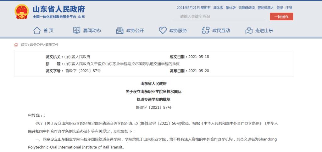 5月20日(ri),山東(dong)職業(ye)學(xue)院(yuan)與俄羅斯(si)烏拉(la)爾國(guo)立交通大學(xue)聯合舉辦的非獨立法人(ren)中外合作辦學(xue)機(ji)構“山東(dong)職業(ye)學(xue)院(yuan)-烏拉(la)爾國(guo)際軌道(dao)交通學(xue)院(yuan)”,獲山東(dong)省(sheng)人(ren)民政(zheng)府(fu)正式(shi)批復。