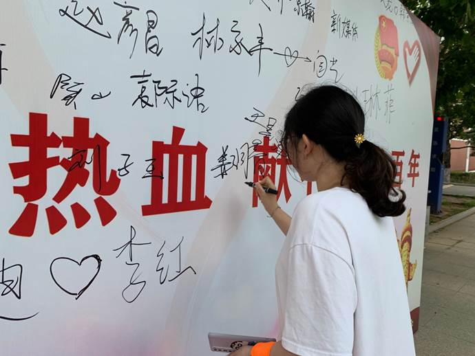 獻(xian)血(xue)結(jie)束后,同學們紛(fen)紛(fen)在簽名(ming)墻上(shang)簽名(ming)留(liu)言。