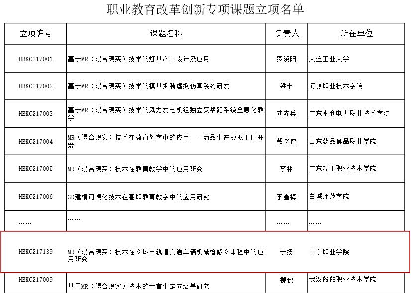 7月26日(ri),教(jiao)育部公布了“第二批國家(jia)級職業教(jiao)育教(jiao)師教(jiao)學創新(xin)團隊立項建設(she)單位(wei)”遴選結果,我校(xiao)城市軌道車輛(liang)應用(yong)技(ji)術專業教(jiao)學團隊成功入(ru)選。同時,教(jiao)育部行指委公布職業教(jiao)育改革創新(xin)課題立項名單,我校(xiao)于揚老(lao)師負責(ze)的(de)《MR(混合現實)技(ji)術在<城市軌道交通車輛(liang)機械(xie)檢修(xiu)>課程中(zhong)的(de)應用(yong)研究》名列其中(zhong)。