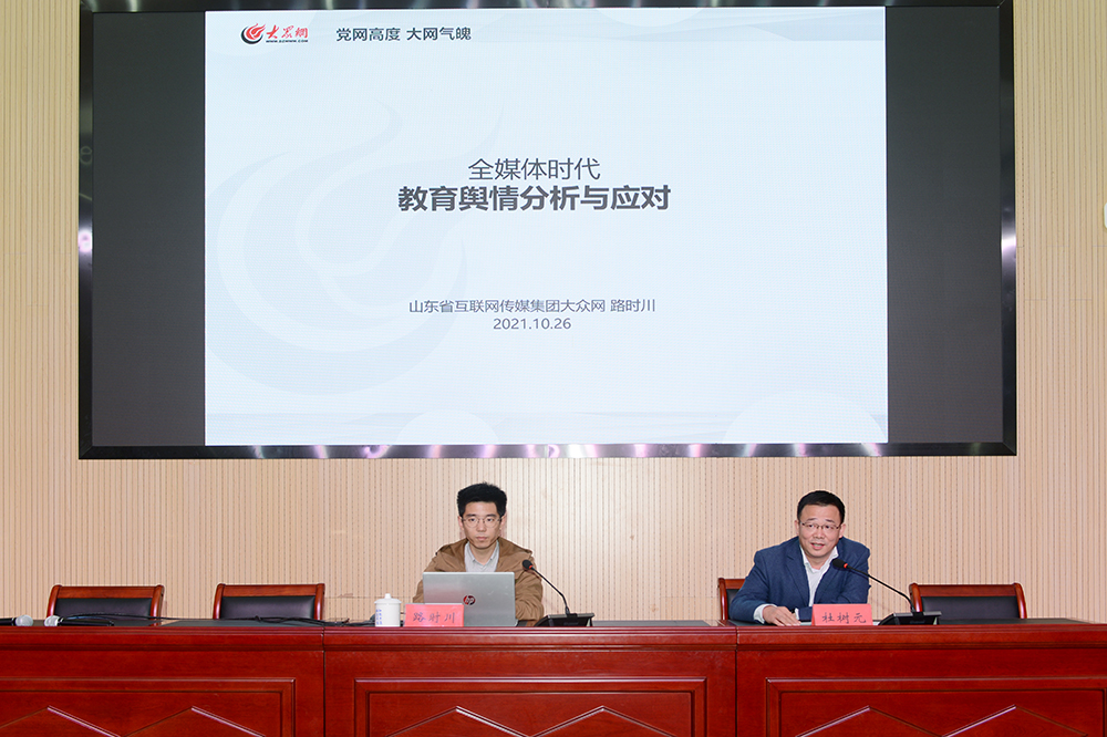 為提(ti)高我(wo)校教(jiao)職工媒介素養,增強輿(yu)情(qing)(qing)判斷與(yu)研究能力,提(ti)升輿(yu)情(qing)(qing)應對(dui)與(yu)處(chu)置水平,10月26日,我(wo)校在東報(bao)告廳舉辦(ban)了輿(yu)情(qing)(qing)分(fen)析與(yu)應對(dui)培(pei)訓會。山東省互聯網傳媒集團大(da)眾(zhong)網?海報(bao)新聞教(jiao)育頻道總監路(lu)時川(chuan)應邀作了題為《全(quan)媒體時代教(jiao)育輿(yu)情(qing)(qing)分(fen)析與(yu)應對(dui)》的輔導報(bao)告。培(pei)訓會由黨委宣傳部部長杜(du)樹(shu)元主持。
