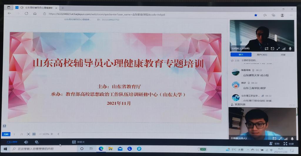 為進一步(bu)提(ti)升輔導(dao)員心理健康教育(yu)工作能力(li),提(ti)高(gao)心理健康教育(yu)工作的(de)針(zhen)對性(xing)、實效(xiao)性(xing),11月17下(xia)午、21日上午,我校組織全(quan)體輔導(dao)員、學(xue)工人員參(can)加了由(you)中共(gong)山東省委教育(yu)工委舉辦的(de)全(quan)省高(gao)校輔導(dao)員心理健康教育(yu)專(zhuan)題培(pei)訓班。