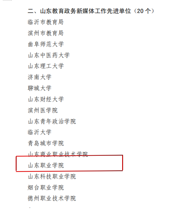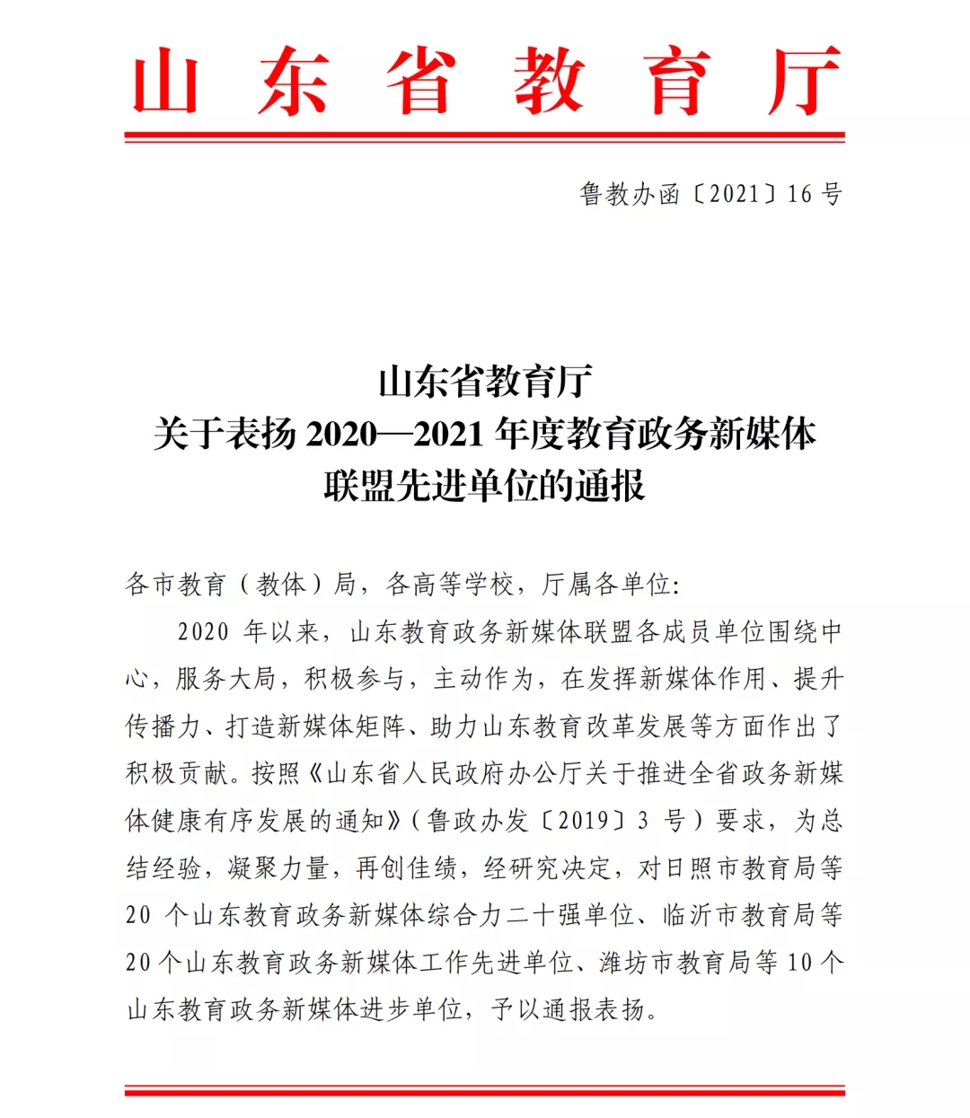 近日,山(shan)東省教(jiao)育廳(ting)印發《山(shan)東省教(jiao)育廳(ting)關于表(biao)揚2020—2021年(nian)度教(jiao)育政務新(xin)媒(mei)體(ti)聯盟先進單(dan)位的通報(bao)》,我校榮獲“山(shan)東教(jiao)育政務新(xin)媒(mei)體(ti)工(gong)作先進單(dan)位”稱號。