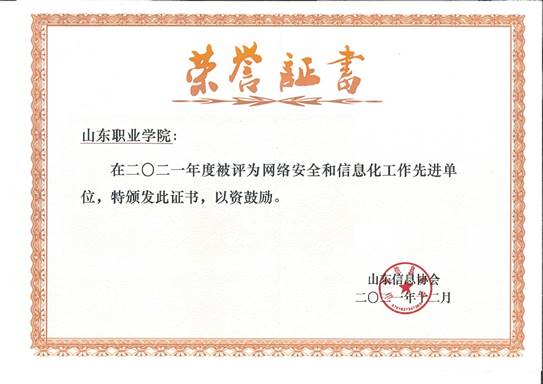 12月4日,山東信(xin)息(xi)協會在(zai)(zai)濟南召(zhao)開山東省網(wang)絡安全和(he)信(xin)息(xi)化(hua)論壇暨(ji)信(xin)創生態高端論壇,對(dui)在(zai)(zai)網(wang)絡安全和(he)信(xin)息(xi)化(hua)工作中做出貢獻的單位(wei)和(he)個人進行了表(biao)(biao)彰(zhang)。我(wo)校因(yin)工作表(biao)(biao)現突出,被山東信(xin)息(xi)協會授予2021年度網(wang)絡安全和(he)信(xin)息(xi)化(hua)工作先進單位(wei)榮(rong)譽稱號。