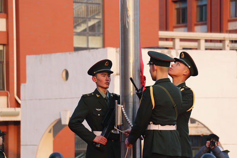 7點30分,國旗護(hu)衛隊目光如炬、步(bu)調一(yi)致,護(hu)送國旗入場。伴隨著激昂雄壯的(de)(de)《義勇(yong)軍進行曲》,旗手振臂一(yi)揮,鮮艷的(de)(de)五星紅旗在全體師(shi)生(sheng)的(de)(de)莊嚴注目中冉冉升起。師(shi)生(sheng)齊聲高唱國歌,傳(chuan)遞(di)著自己對(dui)祖國的(de)(de)熱(re)愛(ai)和崇高敬意。