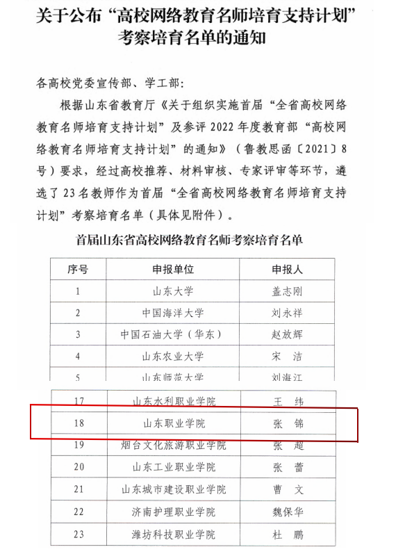 2月21日(ri),山東(dong)省教育(yu)廳印發《關(guan)于公(gong)布“高校網絡教育(yu)名師(shi)培(pei)育(yu)支持(chi)計(ji)劃”考(kao)察培(pei)育(yu)名單的(de)通知》,我校易安書院副院長張錦入選(xuan)首(shou)屆(jie)山東(dong)省高校網絡教育(yu)名師(shi)培(pei)育(yu)支持(chi)計(ji)劃考(kao)察培(pei)育(yu)名單。
