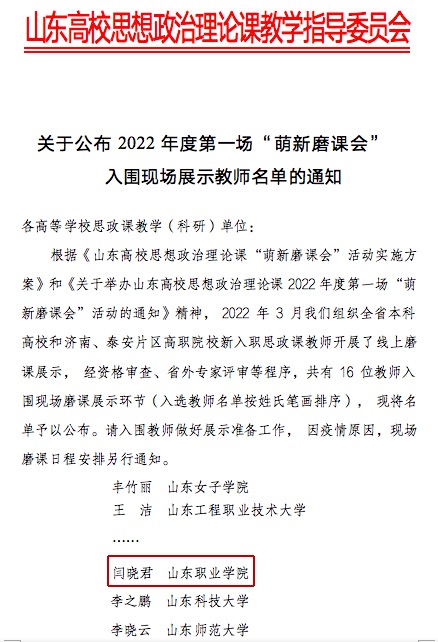 近日,山(shan)東(dong)高校思(si)想(xiang)政治理(li)(li)論課(ke)教學指(zhi)導委員會公布了山(shan)東(dong)高校思(si)想(xiang)政治理(li)(li)論課(ke)2022年度第一場“萌新磨課(ke)會”入(ru)圍(wei)現場展示環節教師(shi)名(ming)單,我校教師(shi)閆曉君成功入(ru)圍(wei)。