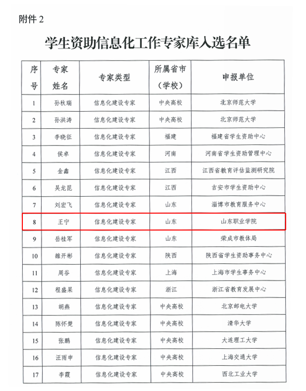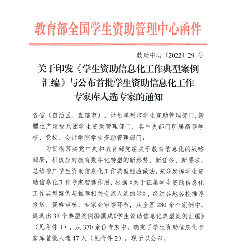 2022〕29號),我校《用信息化推動資(zi)助(zhu)工(gong)作“有的放矢”》案例成(cheng)功入選,學生工(gong)作處王寧入選專家庫。