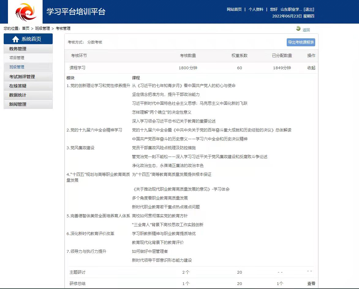 本次培(pei)(pei)訓(xun)依托國家(jia)教(jiao)育行(xing)政(zheng)學院中(zhong)(zhong)國教(jiao)育干部網絡學院進行(xing)線(xian)上(shang)培(pei)(pei)訓(xun),主(zhu)要圍繞(rao)黨的(de)(de)創新理論學習(xi)和黨性(xing)修養(yang)提升(sheng)、黨的(de)(de)十九屆六中(zhong)(zhong)全會精(jing)神(shen)、黨風廉政(zheng)建設、“十四五 ”規(gui)劃與職業高等教(jiao)育高質量發展、完善(shan)德(de)智(zhi)體美勞全面培(pei)(pei)養(yang)育人體系、深化新時代教(jiao)育評價改革、領(ling)導(dao)(dao)力與執行(xing)力提升(sheng)等七個方面設置課程(cheng),選聘專(zhuan)家(jia),注(zhu)意體現(xian)高職院校(xiao)及高職院校(xiao)領(ling)導(dao)(dao)干部的(de)(de)特點(dian)和需求,實效性(xing)和針對性(xing)強。培(pei)(pei)訓(xun)內容包括課程(cheng)學習(xi)、主(zhu)題研討和撰寫培(pei)(pei)訓(xun)心(xin)得體會三(san)個環節,內容全面、豐富多樣(yang)。