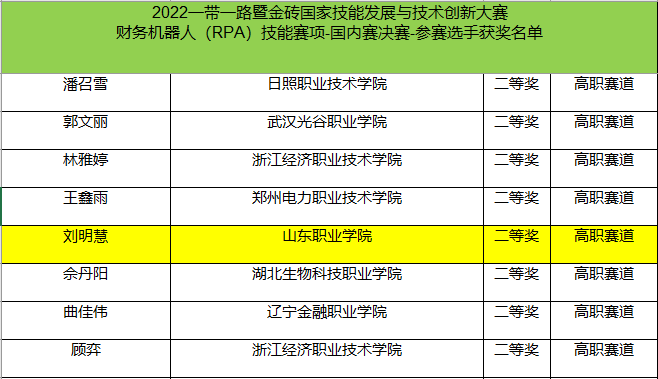 7月30日(ri),由(you)大數據與(yu)會計教研室主任(ren)劉春霞和李勉老(lao)師指導的學(xue)生參加(jia)了“2022一帶(dai)一路暨(ji)金磚國家技(ji)能發展與(yu)技(ji)術(shu)創(chuang)新大賽財(cai)務機器人(RPA)技(ji)能賽項”,共有來自全國400所院校(xiao)、1100名選手參加(jia)決賽,經過激烈角逐,取得了二等(deng)獎(jiang)1個、三等(deng)獎(jiang)2個和優(you)秀獎(jiang)1個,學(xue)校(xiao)榮獲優(you)秀組織(zhi)獎(jiang)。