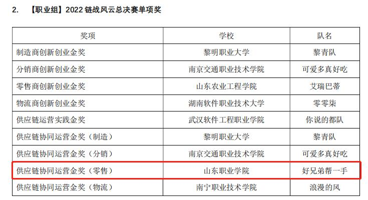 6月17日,由現代物流(liu)管理教研室主(zhu)任(ren)吳向峰和劉浩老師帶(dai)領的(de)兩(liang)支(zhi)隊伍(wu)參加了(le)第(di)五(wu)屆中國大(da)學生“鏈戰(zhan)風云”智慧供應鏈創(chuang)(chuang)新創(chuang)(chuang)業大(da)賽,在307支(zhi)高職(zhi)參賽隊伍(wu)中取得(de)第(di)十(shi)名的(de)好(hao)成績,兩(liang)支(zhi)隊伍(wu)分別獲得(de)“金獎(jiang)”一(yi)項(xiang)、“銀獎(jiang)”一(yi)項(xiang),物流(liu)供應商運營(ying)單項(xiang)金獎(jiang)一(yi)項(xiang)的(de)好(hao)成績。