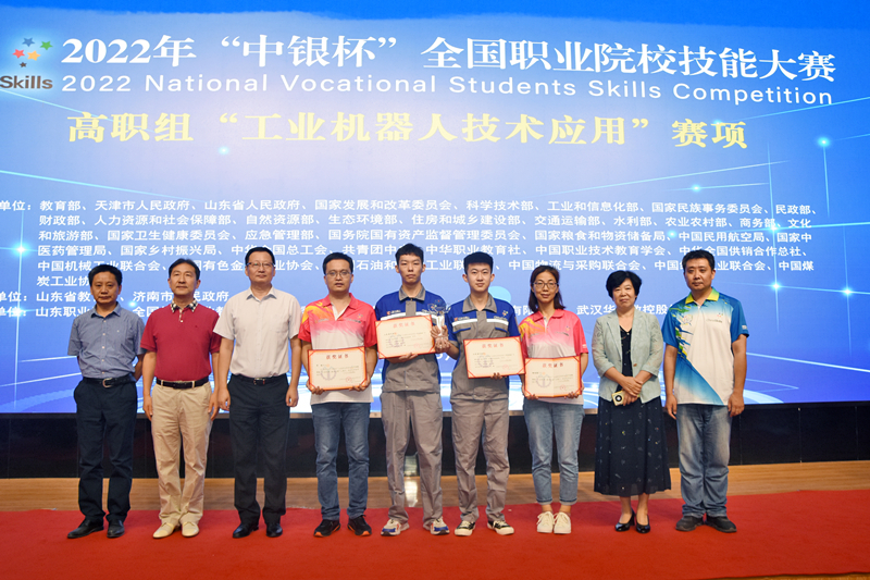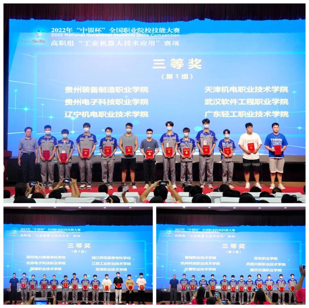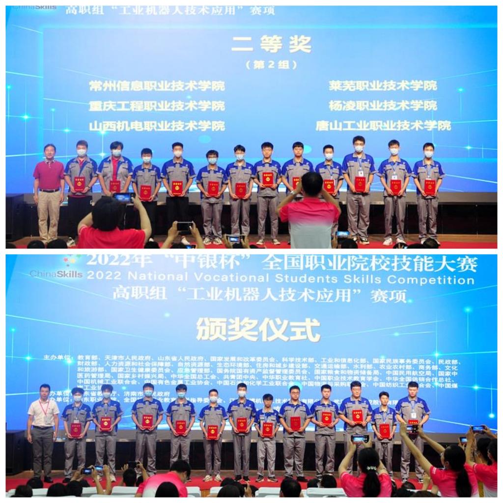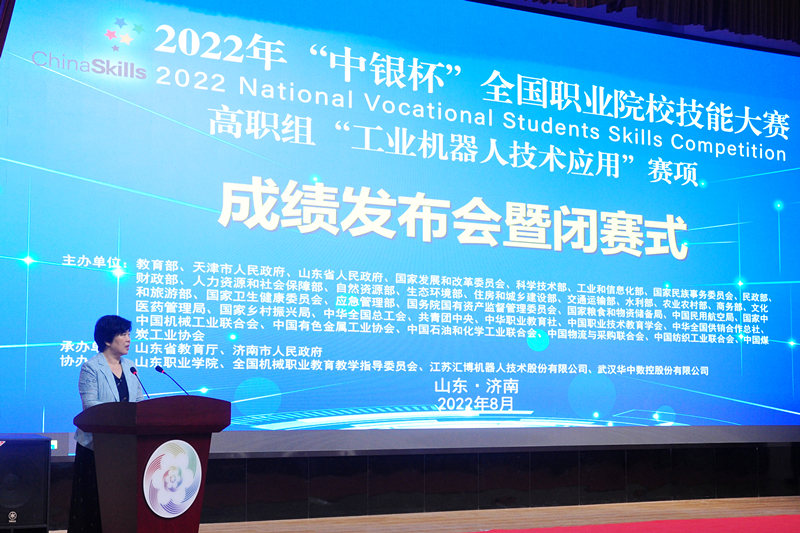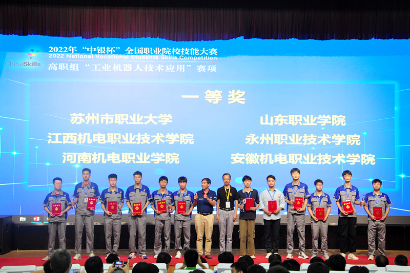 8月26日,2022年“中(zhong)銀杯”全(quan)國(guo)職業(ye)(ye)院(yuan)(yuan)(yuan)校(xiao)技能大賽(sai)(sai)(sai)高職組(zu)(zu)“工業(ye)(ye)機器人(ren)技術應用”賽(sai)(sai)(sai)項(xiang)(xiang)閉(bi)賽(sai)(sai)(sai)式(shi)在我(wo)校(xiao)圖書行(xing)政(zheng)樓西報告(gao)廳舉行(xing)。賽(sai)(sai)(sai)項(xiang)(xiang)專(zhuan)家(jia)(jia)組(zu)(zu)組(zu)(zu)長范進楨、賽(sai)(sai)(sai)項(xiang)(xiang)裁(cai)判長熊(xiong)越東、賽(sai)(sai)(sai)項(xiang)(xiang)監督(du)仲裁(cai)組(zu)(zu)長蔣曉剛,山(shan)東職業(ye)(ye)學院(yuan)(yuan)(yuan)黨委副書記郭培謙、副院(yuan)(yuan)(yuan)長王紹軍(jun)及監督(du)仲裁(cai)組(zu)(zu)成員(yuan)、專(zhuan)家(jia)(jia)組(zu)(zu)成員(yuan)、合作企業(ye)(ye)領導等出席閉(bi)賽(sai)(sai)(sai)式(shi)。各(ge)參(can)賽(sai)(sai)(sai)隊領隊、指導教師、參(can)賽(sai)(sai)(sai)選手(shou)等參(can)加(jia)閉(bi)賽(sai)(sai)(sai)式(shi)。學校(xiao)副院(yuan)(yuan)(yuan)長祝瑞花主持閉(bi)賽(sai)(sai)(sai)式(shi)。