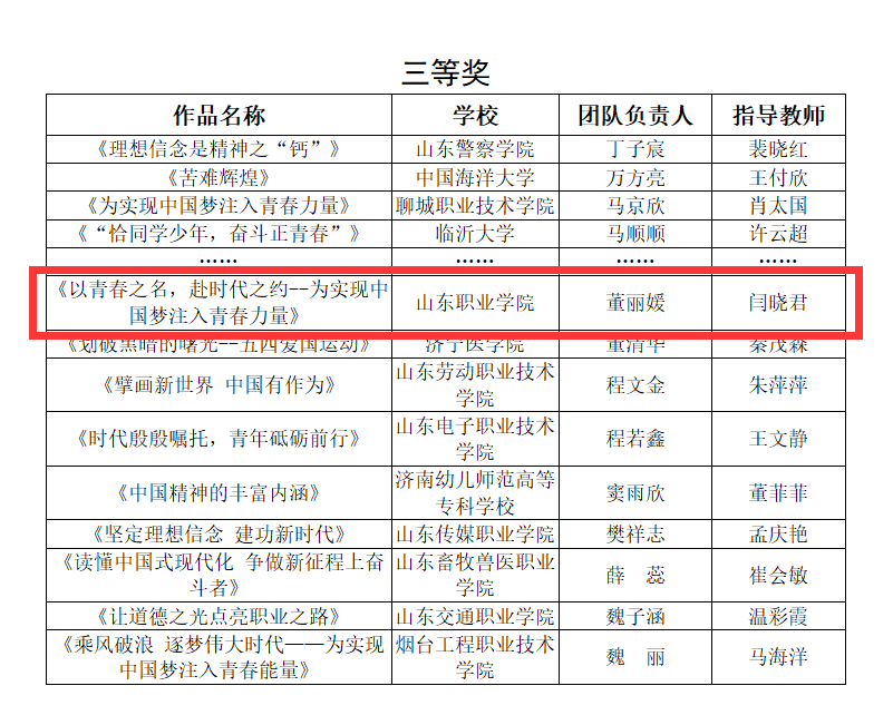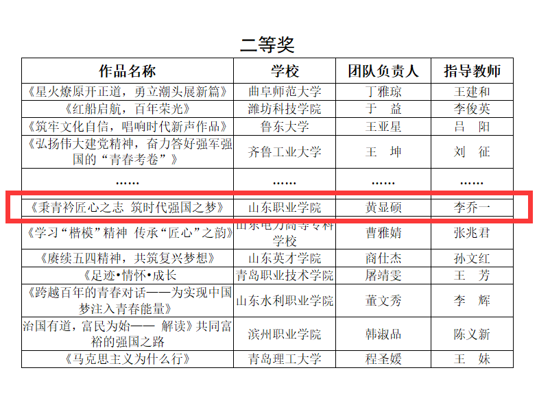 其中,由王(wang)楠、丁亞盼(pan)、索敏擔任指(zhi)導教(jiao)師,學生賈明揚、陳翔宇、張高(gao)健、宋(song)鴻杰創(chuang)作的(de)作品《從核酸(suan)貼紙看(kan)中華(hua)優秀傳統文化(hua)的(de)“兩(liang)創(chuang)”》獲(huo)得(de)省一等(deng)獎;由教(jiao)師李喬一、張燕(yan)青、苑承麗(li)指(zhi)導的(de)作品《秉青衿匠心之志(zhi) 筑(zhu)時代強國之夢》獲(huo)得(de)省二等(deng)獎;由教(jiao)師閆曉(xiao)君、段潔、侯成(cheng)飛指(zhi)導的(de)作品《以青春之名,赴時代之約——為(wei)實現中國夢注入青春力量》獲(huo)得(de)省三等(deng)獎。