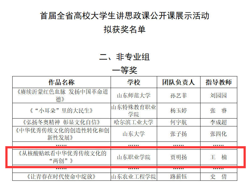 近日,山東(dong)省(sheng)(sheng)教育廳對首屆全省(sheng)(sheng)高校大學生講思政課(ke)公開(kai)課(ke)展示活動結果進行了公示,我校馬克思主(zhu)義學院選送的(de)3件作品分別獲得省(sheng)(sheng)一等(deng)獎、二等(deng)獎、三等(deng)獎。