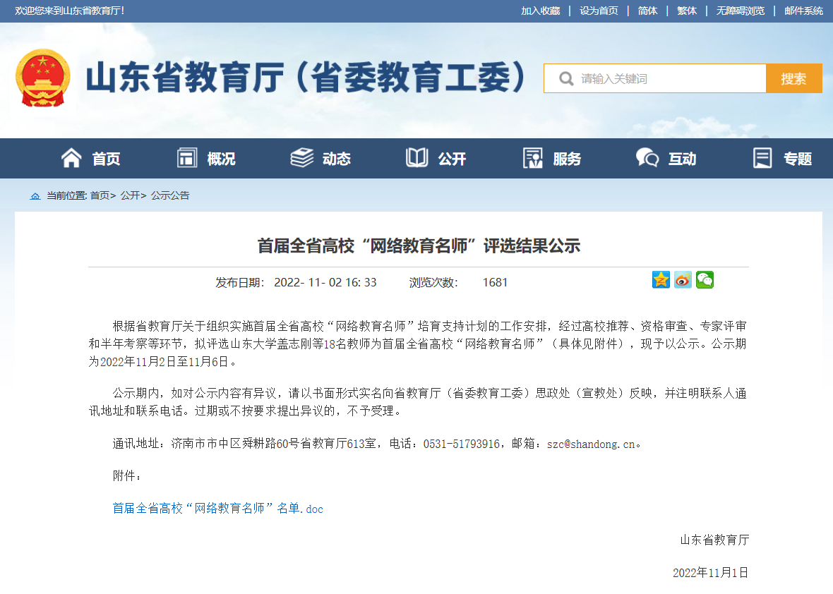 近日,山東省教育廳對首屆(jie)全省高校(xiao)“網絡教育名師(shi)”評選(xuan)結果(guo)進(jin)行了公示,我校(xiao)易安書院副院長張(zhang)錦入選(xuan)首屆(jie)全省網絡教育名師(shi)。