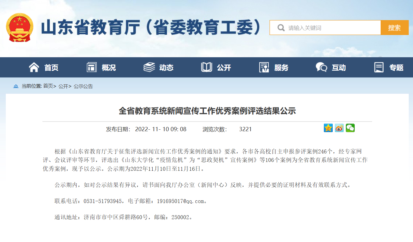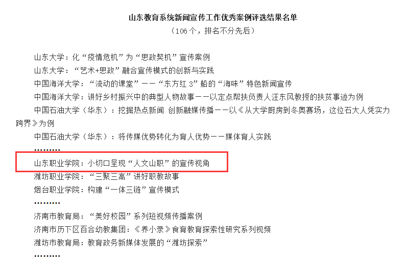 11月10日(ri),山(shan)東(dong)省(sheng)教育廳公示了全省(sheng)教育系統新(xin)聞宣(xuan)傳工(gong)作優(you)秀案例評選結(jie)果,我(wo)校宣(xuan)傳部報送的(de)案例《小切口呈現“人文山(shan)職”的(de)宣(xuan)傳視角》 成功入選。