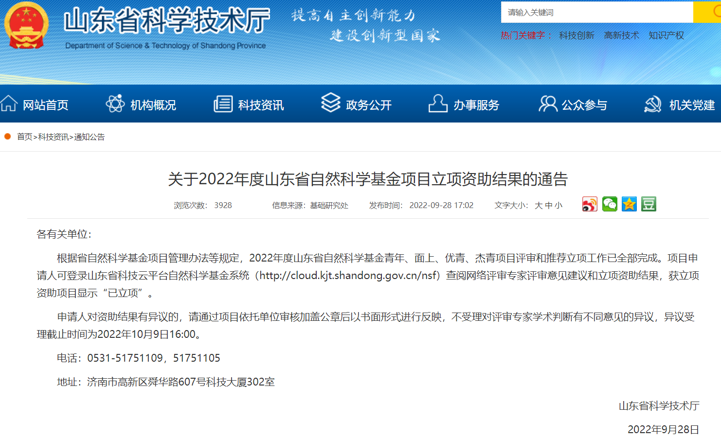 近日,山東(dong)省(sheng)科技廳發布《關于2022年度山東(dong)省(sheng)自(zi)然科學基(ji)金(jin)(jin)項(xiang)(xiang)(xiang)目立項(xiang)(xiang)(xiang)資助(zhu)結果的(de)通告(gao)》,我校獲(huo)批(pi)立項(xiang)(xiang)(xiang)資助(zhu)5項(xiang)(xiang)(xiang),其中青年基(ji)金(jin)(jin)4項(xiang)(xiang)(xiang),面上項(xiang)(xiang)(xiang)目1項(xiang)(xiang)(xiang),共獲(huo)得自(zi)然科學基(ji)金(jin)(jin)項(xiang)(xiang)(xiang)目資助(zhu)經費70萬元,實現了我校省(sheng)部級自(zi)然科學研究的(de)重大突(tu)破。