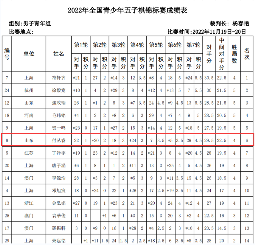 比(bi)賽共有來自全國(guo)17支(zhi)省代表(biao)隊的近300名棋(qi)手參(can)加,我校高彭老師帶(dai)領付(fu)叢睿(rui)同學參(can)加了本次比(bi)賽。經過(guo)七(qi)輪激烈角逐,最終付(fu)叢睿(rui)獲得全國(guo)青少年五(wu)子棋(qi)錦標賽男子青年組第六名的好成績(ji)。