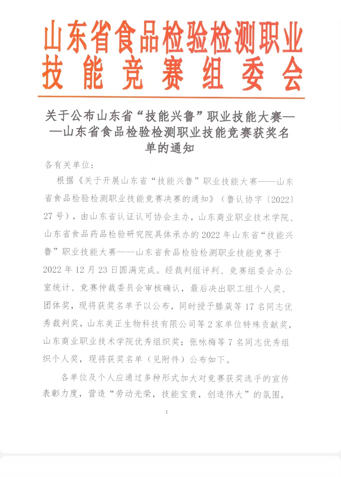 12月23日,由山東省認證認可協會主辦(ban)的2022年山東省“技能(neng)興魯”職(zhi)業技能(neng)大(da)賽(sai)--食品檢驗檢測(ce)職(zhi)業技能(neng)競賽(sai)圓滿結束。我校生物工(gong)程學院王俊(jun)麗、鄧鳳霞兩位教師參(can)加了職(zhi)工(gong)組(zu)比賽(sai),分別榮獲職(zhi)工(gong)組(zu)個人一等(deng)獎(jiang)和(he)三等(deng)獎(jiang),學校參(can)賽(sai)隊榮獲職(zhi)工(gong)組(zu)團(tuan)體二等(deng)獎(jiang)。