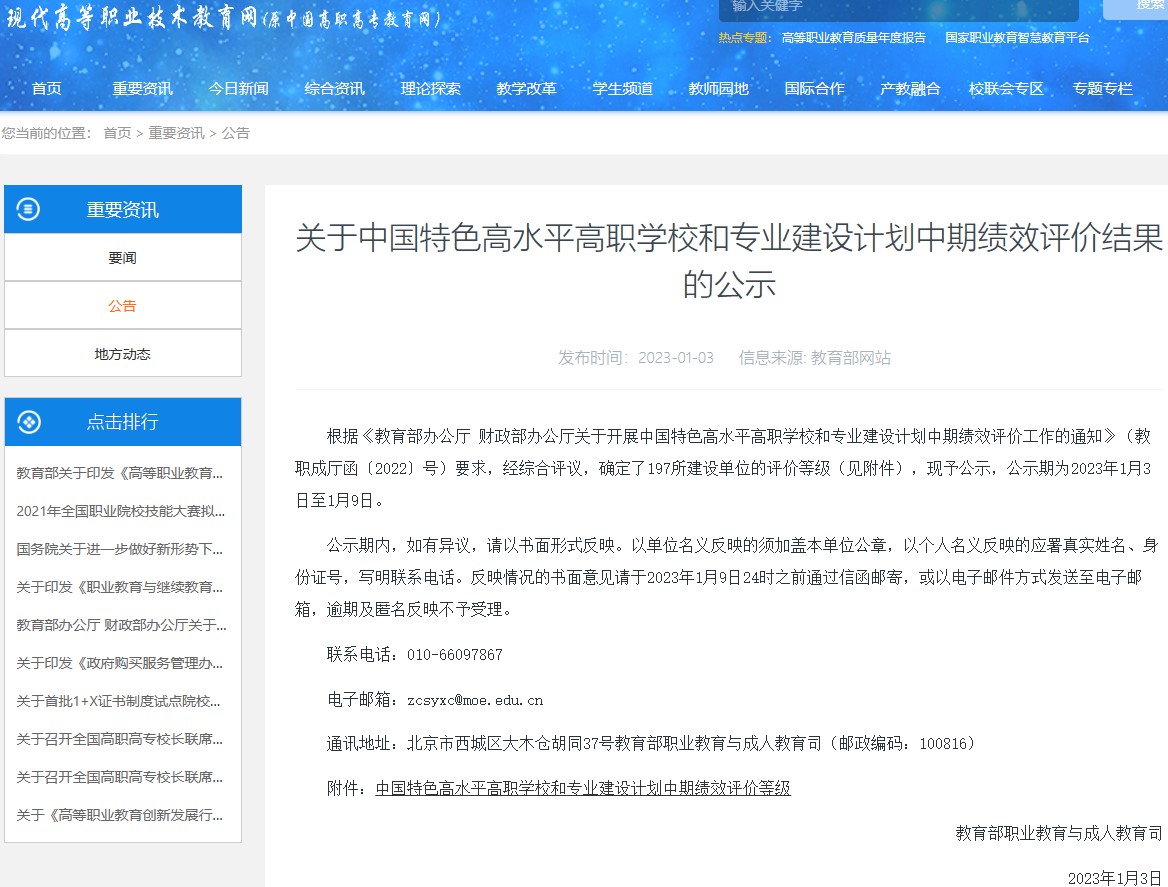 近日,教育部發布《關于中(zhong)國(guo)特(te)色高(gao)水(shui)平高(gao)職學校(xiao)和專業建設計劃中(zhong)期績效評價(jia)結(jie)果的公(gong)示》,確(que)定了全國(guo)197所“雙高(gao)計劃”建設單位的評價(jia)等(deng)級,我校(xiao)獲評“優秀”等(deng)級。