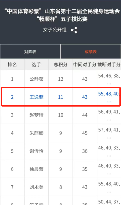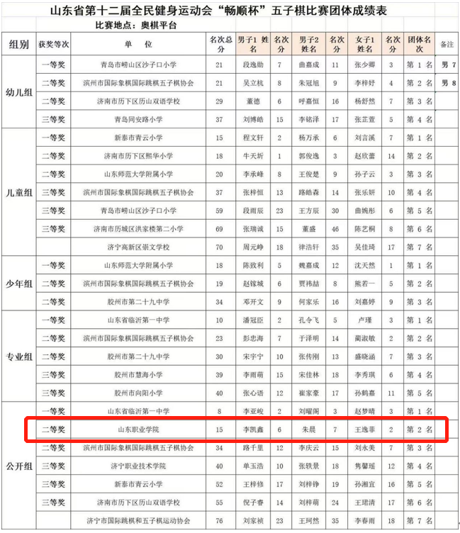 1月(yue)14日,“中國體(ti)育彩(cai)票”山東省(sheng)第(di)十二屆全民健(jian)身運動會“暢順杯”五子(zi)棋比(bi)賽圓滿落下帷幕。我校付叢睿同(tong)(tong)學(xue)榮(rong)獲男子(zi)專業組(zu)冠軍,王逸菲(fei)同(tong)(tong)學(xue)榮(rong)獲女子(zi)公(gong)開組(zu)亞軍,學(xue)校取得團(tuan)體(ti)第(di)二名的好成績。