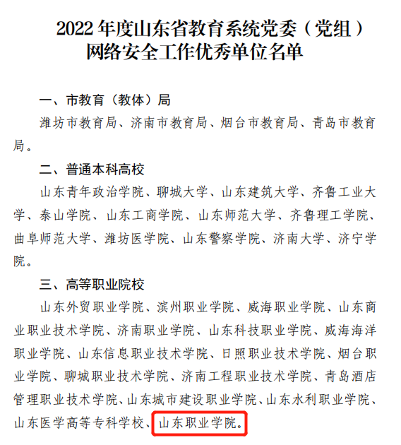 近(jin)日(ri),省委(wei)(wei)教育(yu)(yu)工(gong)委(wei)(wei)對各市黨(dang)委(wei)(wei)教育(yu)(yu)工(gong)委(wei)(wei)、各高等學校黨(dang)委(wei)(wei)網絡安全工(gong)作(zuo)責(ze)任制落實(shi)情況(kuang)進行了綜合考核,我校因在網絡安全工(gong)作(zuo)方(fang)面表現(xian)突出,榮獲(huo)2022年度(du)山東省教育(yu)(yu)系統(tong)黨(dang)委(wei)(wei)(黨(dang)組)網絡安全工(gong)作(zuo)優秀單位(wei)。
