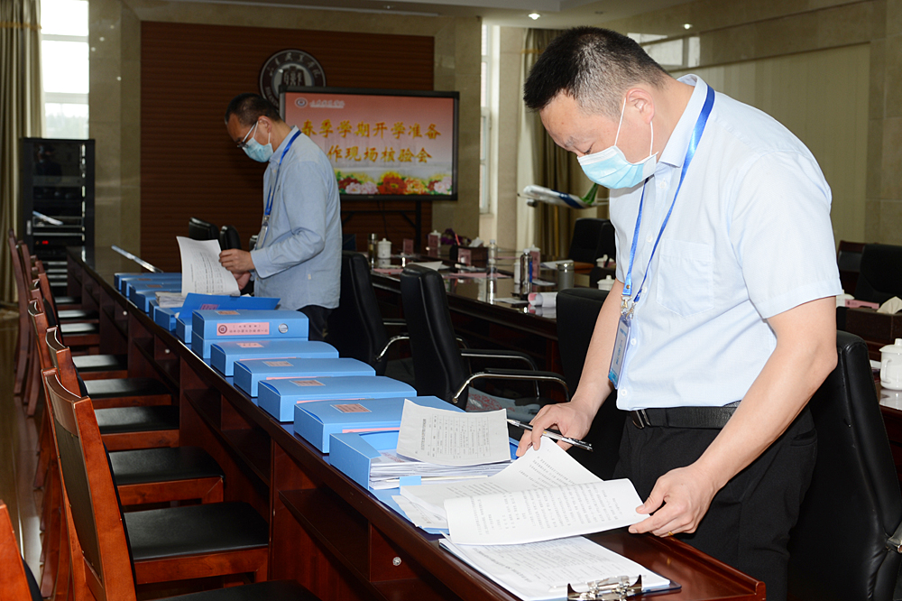 核驗(yan)專家(jia)組(zu)仔細查閱了學(xue)院(yuan)防控工作(zuo)檔案材(cai)料,圍繞《山東省高(gao)等(deng)學(xue)校2020年春季(ji)學(xue)期開學(xue)條件核驗(yan)細則》要求(qiu),對學(xue)院(yuan)開學(xue)方(fang)案制定、相關防控機制建立、專項制度建設(she)、教(jiao)職工管(guan)理(li)(li)與全員(yuan)培訓(xun)、應急處置、物資保障(zhang)、清潔消毒(du)、隔離(li)區域、餐飲管(guan)理(li)(li)、宿舍管(guan)理(li)(li)、錯峰返校、校園(yuan)出入管(guan)理(li)(li)、教(jiao)學(xue)準備等(deng)方(fang)面的情況(kuang)進行了全面、細致的調研、核驗(yan)。專家(jia)組(zu)成員(yuan)在查看相關設(she)施、資料的同(tong)時,就相關問題向現場人員(yuan)詢問了工作(zuo)流(liu)程、做(zuo)法。